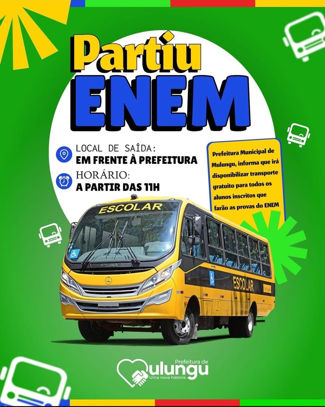 A Prefeitura de Mulungu reafirma seu compromisso com a educação e o futuro da nossa juventude, garantindo o transporte gratuito para os estudantes do município que irão participar do Exame Nacional do Ensino Médio (ENEM).